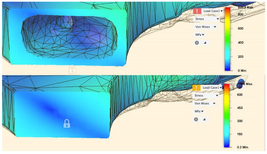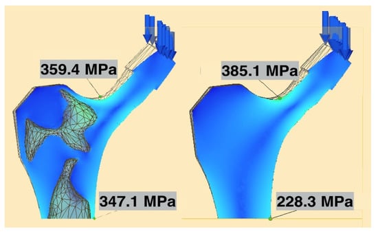 Maximum neck and stem stresses in the selectively hollowed (left) and solid (right) implants. The selectively hollowed implant had marginally lower neck stresses, but higher internal stem stresses compared to its solid equivalent. The image is cropped 10 mm from the distal fixed face.