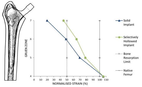 Maximum principal strains were measured on the bone surface along the perimeter of the proximal-most plane for each of Gruen zones 4–7 [41]. Percentage strain was calculated by dividing peri-implant strain values with the native femoral strain values. It has been suggested that a reduction in strain of more than 50% (percentage strain < 50%) predicts bone resorption in that region [7]. By comparing percentage strain of the solid and selectively hollowed implants, improvements to strain shielding were quantified, and changes to trend along the length of the femur were observed.