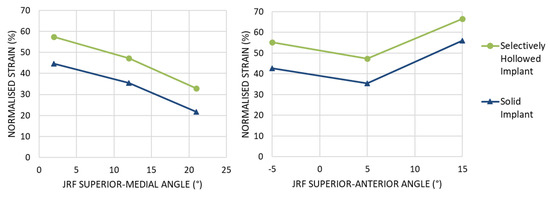 Peri-implant surface bone strain as a percentage of the strain measured for the native femur at Gruen zone 6 for different angles of joint reaction force (JRF). (Left) Variation in the coronal plane. (Right) Variation in the sagittal plane. For all load cases examined, the selectively hollowed implant resulted in less strain shielding than the solid reference implant.