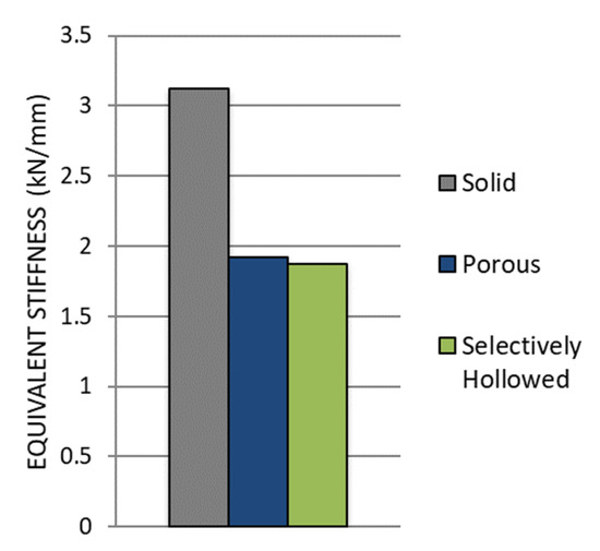 The porous and selectively hollowed implants were both more compliant than the solid reference implant: There was a decrease in the equivalent stiffness of 39% and 40%, respectively (Figure 11). There was minimal difference between the stiffnesses of the two compliant implant designs, with the porous implant being only 3% stiffer than the selectively hollowed implant.
