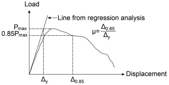 The ductility, µ, of specimens (summarized in Table 2) is calculated using the method proposed by Cohn and Bartlett [24], as shown in Figure 1. The ductility of specimens that exhibited yield failure was approximately 10 times greater than those of specimens that underwent bond failure. This shows that the prevention of bond failure in flexural reinforced concrete members is important in seismic design.