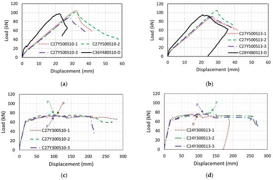 Load–displacement curves: (a) C27Y500S10 (b) C27Y500S13 (c) C27Y300S10 (d) C24Y300S13.