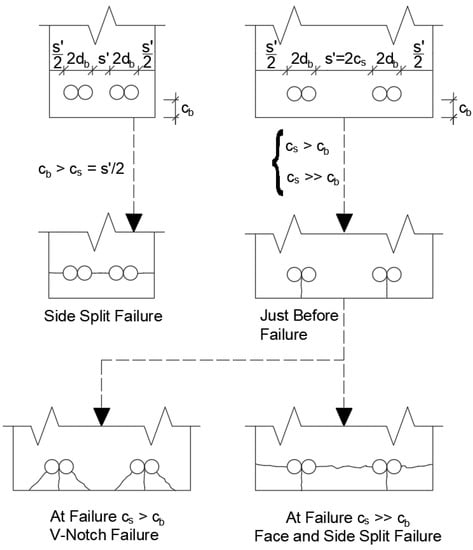 The mode of failure of specimens with lap splices is governed by the cover thickness of lap-spliced bars. Figure 8 shows some basic failure patterns of reinforced concrete members with lap splices [32]. If side cover is less than bottom cover specimen will have side split failure. On the other hand, if bottom cover is less than side cover, depending on the difference between the thickness of these cover either V-Notch failure or face and side split failure may occur.