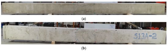 Figure 10 shows the typical cracks on the sides and bottom of specimens (C27Y300S10 and C24Y300S13), which fail due to rebar yielding. Vertical flexural cracks first occurred at the lap splice ends corresponding to a point near the end of the load–displacement curve’s elastic region. Splitting cracks occurred at the sides and bottom of beams near the lap splice. After the peak load (indicated by arrows in Figure 7c,d), the load–displacement curve drops because of concrete crushing in the compression region, as shown in Figure 10b. Because these beams had relatively large bending capacities, severe transverse cracks at the bottom and flexural cracks at the sides occurred outside the lap splice region. The number and width of flexural cracks continued to increase with displacement. The density and width of cracks on one side of the midspan (lap splice) considerably exceeded those of other side cracks because of the uneven load distribution at loading points. This asymmetric cracking and loading behavior were also reflected by the strain in lap splices, as discussed in the following section.