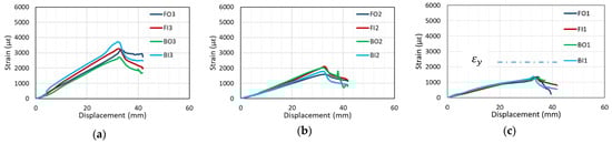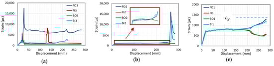 Strain–displacement curves of beam undergoing yield failure (C27Y300S10-1): (a) FO3, FI3, BO3, and BI3 (b) FO2, FI2, BO2, and BI2 (c) FO1, FI2, BO1, and BI1.