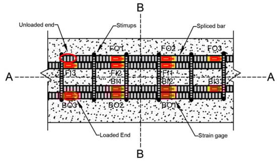 Figure 13 shows the location of strain gauges for beams with 13 mm diameter stirrups. Similar to the strain–displacement curves shown in Figure 12, the behavior of rebars on the same side starting from Centerline A of the lap splice exhibits the same trends (e.g., the strain curves of FO3, FO2, and FO1 have same trends as those of BI3, BI2, and BI1). However, strain values probably differ because of the asymmetric construction of beams with respect to Centerline A. Although FO3 and BI3 are both located at the loaded end and on the same side from Centerline B, the strain readings in these two gauges differ because of the unsymmetric loading condition of the test setup with respect to Centerline B. If asymmetric behavior about Centerline A and B becomes larger, local stress concentration in lap-splice bonding will be severe and then strength and stiffness of the beam will be reduced accordingly.