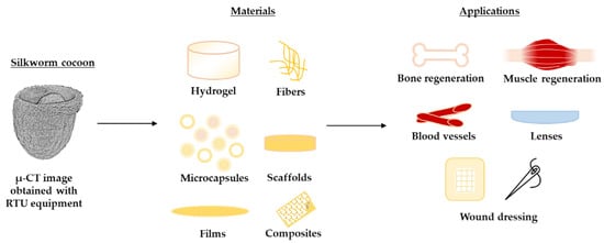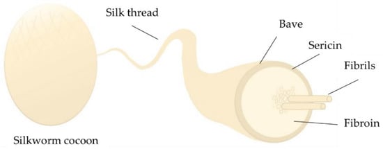 Silk fibroin is a widespread organic phase in composite materials. Bombyx mori silk is the most studied silk due to its outstanding properties. Although silk has been around for centuries, its primary use has been textile industry, but its use in medicine is quite new []. Silk’s main components are proteins, wax (in bave), sericin, and fibroin (Figure 1).