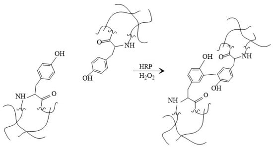 As mentioned before, SF can be made into hydrogels, which can be used as drug delivery systems or implants. To enhance SF mechanical properties, gelatin is added. Gelatin (G) is an amphoteric, natural protein derived from collagen []. SF can be crosslinked physically or chemically. Physical crosslinking, such as electric current or heating, is safe, inexpensive, and less toxic. During this crosslinking process, ionic interactions occur, thus in chemical crosslinking covalent bonds are created, which are stronger than ionic bonds. Agents that are used in chemical crosslinking are glutaraldehyde and genipin, which create strong bonds, but are not that successful at cell toxicity tests. Enzymatic crosslinking is a subsection of chemical crosslinking. One type of enzymatic crosslinking is shown in Figure 3. To induce this crosslinking type the most used agents are horseradish perioxidase and peroxide (HRP)/H2O2, microbial transglutaminase (mTG), and mushroom tyrosinase. An advantage for enzymatic linking is that it can be easily made in mild aqua solutions, but it is an expensive method [,,]. In the current work, HRP/ H2O2 is used as a crosslinker, because it is widely used, non-toxic, and creates a stable and elastic polymeric network [].
