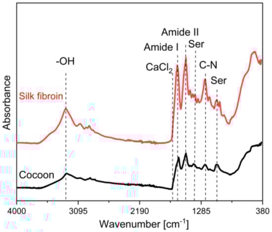 The two main factors that were examined in the spectra were whether there was present sericin (Ser) and CaCl2. Sericin levels weren’t determined with this method after degumming. No characteristic maximums for sericin in 1050 cm−1 or 1400 cm−1 were found. A typical peak in 1657 cm−1 for CaCl2 is not observed [,,,].