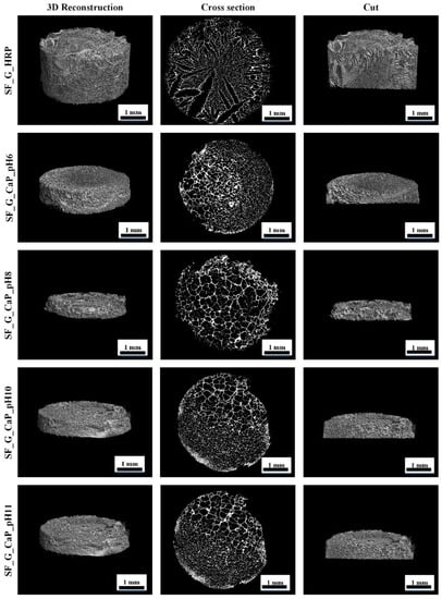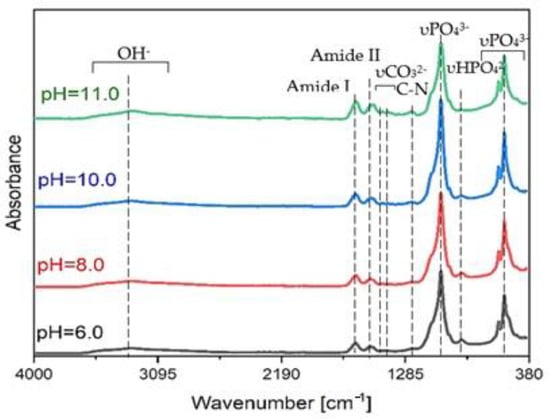 The SF/CaP composite and SF/CaP/G/HRP hydrogel structural, phase, surface properties, and drug release kinetics were examined. Different types of CaP can be synthesized in SF at different pH values. Composites from pH 6 to 8 contain brushite and HAp, however from 10 to 11 pure HAp can be achieved. There is a slight notice of carbonate ions in higher pH value synthesized CaP, but it is not a flaw, because each bone regeneration study needs a specific CaP phase [,]. The interaction between SF and CaP happens on account of carboxyl groups, which are present in SF. They ensure a nucleation center for calcium ions, which bind phosphate ions around themselves.