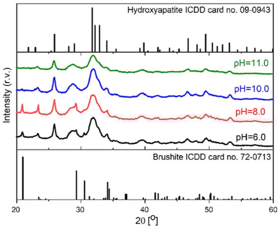 In this study, CaP was obtained in different pH values. In Figure 7, XRD patterns of CaP from pH 6 to pH 11 are shown. All the acquired composites are more amorphous because diffuse diffraction reflexes can be observed. The obtained spectra for each pH values are quite similar, but it changes due to different pH value. From pH 6 to 8, brushite (ICDD card no. 11-0293) is present in the composites. Characteristic brushite peaks at 20.9°, 29.3°, and 30.5° are present with a mix with hydroxyapatite (ICDD card no. 09-0432), but it decreases at higher pH values. As we can see brushite is no longer present, and when pH is 10 or 11, pure hydroxyapatite (HAp) phase in SF solution is obtained. Typical HAp diffraction reflexes can be seen at 31.7°, 32.2°, and 32.9°.