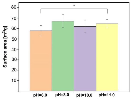 Specific surface area of synthesized composites in SF (n = 3, * p > 0.05).