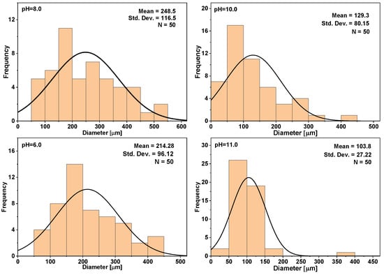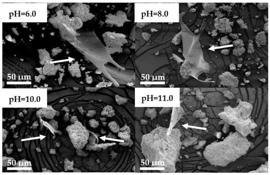 SEM was used to characterize the freeze-dried SF/CaP composite materials. SF is present in all the composites (Figure 9), due to observed fibrils, which are evenly spread throughout the sample. Particle size was measured with “ImageJ” software. The smallest particle size was observed for composite which consisted of both hydroxyapatite and brushite from 6.5 to 50.7 μm (pH = 8), but the largest particles were for the composite with mainly brushite (pH = 6) from 7.8 to 71.3 μm. Composites synthesized at pH = 10 and 11 particles were from 7.1 to 65.0 μm and from 6.6 to 75.6 μm, respectively. Particle size does not change between the different phases of CaP.
