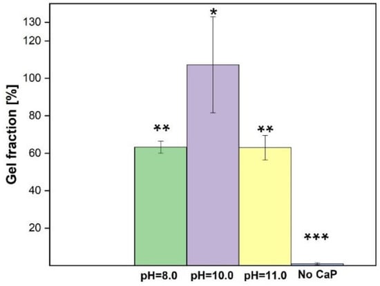 Samples at pH 6 form an unstable hydrogel, which starts to dissolve after 2 h, and therefore it was not possible to obtain a one-piece sample after 48 h. The reason for this might be too low a pH value. At lower pH values, HRP becomes inactive. As HRP is the crosslinker in our research, therefore the gel fraction changes in between the samples []. Gel fraction of the hydrogels synthesized at pH 8 and pH 11 do not statistically differ, which means that CaP type is not the dominant factor that affects how much of insoluble part the hydrogel has. Statistical analysis of the data shows that gel fraction between hydrogels synthesized at pH 8 and pH 11 does not have a significant difference; only hydrogels synthesized at pH 10 and without CaP have a significant difference in gel fraction results.