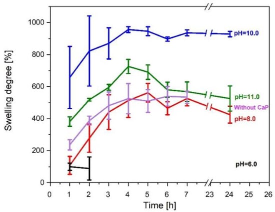 However, hydrogels containing brushite have a relatively lower swelling degree. On the other hand, samples without any kind of CaP swell at first but then degrade after 7 h due to lower gel fraction. Hydrogels made at pH 6 start to dissolve after 2 h, which is due to weak linkage inside hydrogels, however, hydrogels without CaP started to degrade after 24 h but swelled for the first 7 h. The degradation is due to low gel fraction.