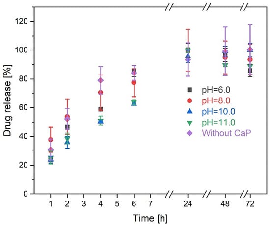 The obtained results show that drug release kinetics was not affected by the CaP phase. The drug is completely released from hydrogels after 24 h, except the one that is made in pH 10, which completely released the drug after 72 h. This could be linked to a high gel fraction, as it is 20–40% higher than other samples.