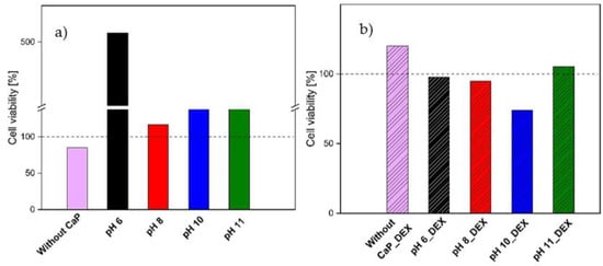 To ensure that obtained hydrogels could be used for medical application, in vitro cell viability tests were performed. The tests confirmed that hydrogels are nontoxic and could proceed further with additional in vitro and in vivo assays. However, there is a significant difference between the samples with CaP and without as well as samples with and without drugs having significantly different cell viability results. Sterilized samples without CaP and drugs showed lower viability (Cell viability > 70%). On the other hand, samples with DEX show slightly higher cytotoxicity compared to samples without drugs. Hydrogel with brushite (pH 6 and pH 8), show cell viability above 95%. Hydrogel with DEX and hydroxyapatite (pH 10) showed lower viability (Cell viability > 70%). The reason why samples with drugs show higher toxicity is that DEX might react with calcium ions and change its coordination []. Comparing blank samples with and without CaP, CaP increases 3T3 fibroblast cell proliferation, thus leftover sericin in samples without CaP might be the reason that these samples show lower viability []. In previous studies, Lie et al. has concluded that SF does not have adverse effect on fibroblast growth [] and the same results can be concluded in our research. Silk fibroin has a positive effect on growth factor expression, which can improve angiopoietins []. Unfortunately, growth factor expression was not studied in our research, but it could be included in future studies. Calcium ions can improve cell proliferation [,], however too much calcium ion concentration can enhance cell death [,]. Looking at the results obtained from different types of CaP-containing phases in the samples, the sample with brushite (pH 6) shows the highest cell viability, which might be due to Ca2+ release. Klammer et al. studied brushite-containing scaffolds, which showed high cell viability as well [], although Z. Shi et al. also concluded that HAp does improve cell proliferation, however particle size and type is the key factor for cell survival []. In future studies, cells could be encapsulated to fully ensure bone regeneration as the sample preparation has mild crosslinking conditions.