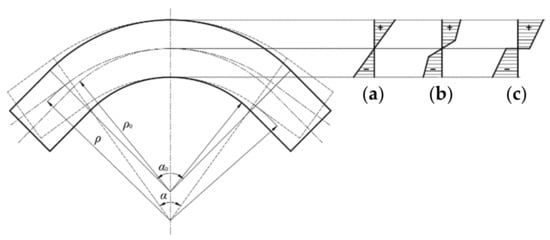 The geometric shape and stress distribution in the bending process of the sheet are shown in Figure 1. The initial elastic deformation and elastic–plastic deformation give way to plastic deformation as drawing deformation increases. However, due to the material’s elastoplastic deformation characteristic, spring-back occurs after the removal of external loads in both the elastoplastic- and plastic-deforming stages, causing a large change in the bending fillet radius, angle, and other size characteristics, which affects dimension precision and performance [32].