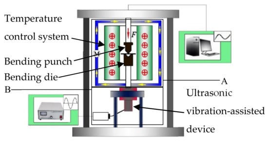 As shown in Figure 2, the experimental principle of the forming assisted by the CEF is to control temperature by the temperature control system (A area) and applying ultrasonic vibration by the ultrasonic vibration-assisted device (B area). The compound of temperature and ultrasonic vibration is realized by the superposition and interaction of temperature and ultrasonic vibration.