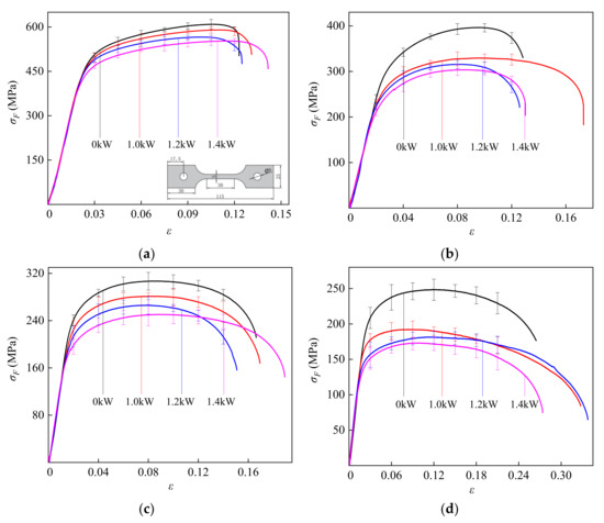 Figure 3 shows the true stress–strain curve of TC2 under the CEF and the specimen—the size of the tensile specimen is shown in Figure 3a. When there is no ultrasonic vibration (0 kW) as is the case under a single-temperature field, as the temperature increases the strength of TC2 continues to decrease, and the overall stress–strain curve shifts downward. When the temperature is below 550 °C, work-hardening is the main characteristic of the true stress–strain curve. When the temperature reaches 600 °C, the high-temperature softening effect appears. Compared with the single-temperature field, when the deformation enters the plastic deformation stage, the stress–strain curve of TC2 is further reduced under the CEF, indicating that the softening effect has occurred and is maintained during the vibration. In addition, the softening effect increased with an increase in ultrasonic power. Hung et al. performed hot upsetting tests and the results indicated that ultrasonic vibration could considerably reduce the forces during forming [36]. Hung et. al. concluded that the mechanisms of increased temperature and energy absorption of dislocation could affect the material property and cause a reduction in forming forces [37]. The regulations presented in these literatures are in accordance with those observed in our tests.