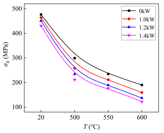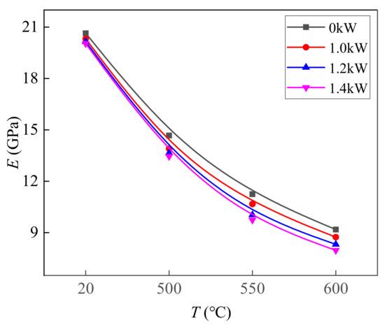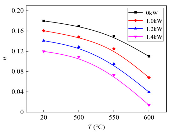 Figure 4, Figure 5 and Figure 6 show the values of σs, n, and E of TC2 titanium alloy under different CEFs. The measurements of σs were all within the 95% confidence interval of the confidence level. The values of n and E were calculated with the true stress–strain curve based on the Swift model [39,40]. It can be seen from the figures that the values of σs, E, and n further reduce when the temperature increases. Compared with the single-temperature field, the reduction in the values of σs and n were larger under the CEF, and the higher the temperature, the greater the reduction in the values of σs and n. However, the effect of the CEF on the value of E was not as obvious as it was on the values of σs and n.