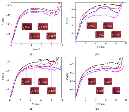 The bending force–punch stroke curve under different CEFs: (a) 20 °C; (b) 500 °C; (c) 550 °C; (d) 600 °C.