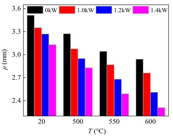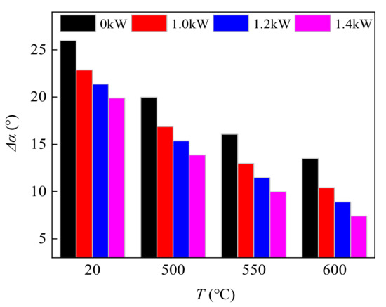 Figure 8 and Figure 9 show a comparison of spring-back and bending fillet radius under different CEF parameters, which were all within the 95% confidence interval of the confidence level. When the parameters of the CEF were 20 °C/0 kW, 500 °C/0 kW, 550 °C/0 kW, and 600 °C/0 kW (the single-temperature field), the spring-back was 25.97°, 19.97°, 16.07°, and 13.01°, respectively. With the increase in temperature, the spring-back continues to decrease. When ultrasonic power was 1.0 kW, the parameters of the CEF were 20 °C/1.0 kW, 500 °C/1.0 kW, 550 °C/1.0 kW, and 600 °C/1.0 kW, and the spring-back of the bending specimen was 22.87°, 16.87°, 12.97°, and 9.4°, respectively. The reduction was 11.9%, 15.5%, 19.2%, 35.1%, respectively. When ultrasonic power increased to 1.4 kW, the parameters of the CEF were 20 °C/1.4 kW, 500 °C/1.4 kW, 550 °C/1.4 kW, and 600 °C/1.4 kW and the spring-back of the banding specimen was 19.89°, 13.87°, 9.97°, and 7.4°, respectively. Compared with the single-temperature field, the reduction was 23.41%, 30.54%, 37.95%, and 45.18%, respectively. When compared, the effect of inhibiting spring-back of the TC2 titanium alloy under the CEF with 550 °C/1.0 kW was consistent with the effect under the single-temperature field at 600 °C. Moreover, the effect of inhibiting the spring-back of the TC2 titanium alloy under the CEF with 550 °C/1.4 kW was consistent with the effect under the single-temperature field at 600 °C. It can be seen that the effect of the CEF on the bending fillet radius is similar to the spring-back shown in the comparison between Figure 8 and Figure 9. Therefore, under the same temperature conditions, the combination of the temperature field and ultrasonic vibration can further improve the bending properties and the quality of the bending specimen of the TC2 titanium alloy. Alternatively, for the same bending specimen of the TC2 titanium alloy, the combination of the temperature field and ultrasonic vibration can lower the forming temperature, which is helpful in reducing production costs.