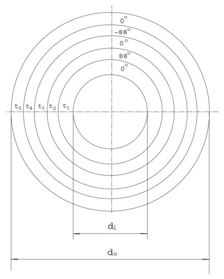 In Figure 2 we show a typical cross section of a composite strut. For orthotropic materials, we normally have three pairs of independent Young’s and shear moduli in the corresponding principal directions, which are often aligned with the matrix orientations. In this study, we choose, according to references [,], , , , , , and , where the subscripts m, h, and z represent the meridional (axial), hoop (circumferential), and radial directions of the composite tube, respectively. The orientation of an orthotropic layer refers to the angle between the meridional direction and the major orthotropic material principal direction. Of course, Poisson’s ratios must satisfy the usual compatibility condition for orthotropic materials []. In this work, we choose , , and . The other associated orthotropic properties, according to Refs. [,], are listed in Table 1.