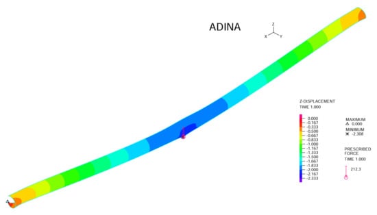 As shown in Figure 3, we simulate a single strut simply supported at its two ends with a maximum center point load (P). The cross-sectional properties of the composite tubes are listed in Table 1. The inner and outer diameters ( and ), the span of the three-point bending (l), and the center point loading (P) are and , , and , respectively.