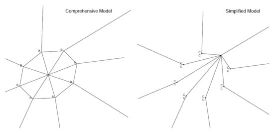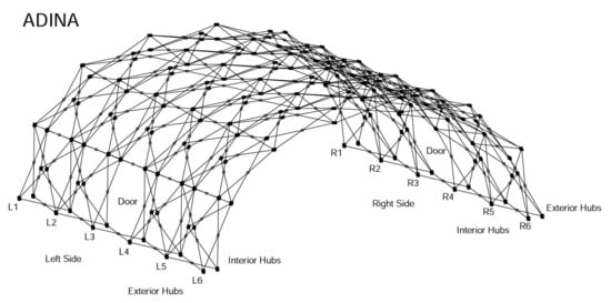 The entire structure models, as shown in Figure 6, are based on the geometrical locations of beam joints created in AutoCAD. Similar finite element analyses of these types of complex structures have been reported in references. [,]. In this study, we focus on both the linear elastic response and linearized buckling analysis of the entire structures as well as the nonlinear analyses. In the finite element modeling, the implementation of the comprehensive model is a very difficult task, considering the large number of scissor points and hubs, and in particular, the groove skew systems with respect to the individual rotational degrees of freedom. Therefore, it is necessary to simplify the entire structural model. To be more specific, for the simplified model, we completely ignored the initial stress effect, and all scissor points are simplified by fixed joints connecting crossing beams. In addition, no relative rotations between beams and hubs are allowed. These simplifications are validated by the comparisons of the linear and nonlinear responses of both comprehensive and simplified models. Nevertheless, we must be aware that the assumptions also make the simulation model more stable than the real structure which provide an upper bound for the estimate of the collapse load.