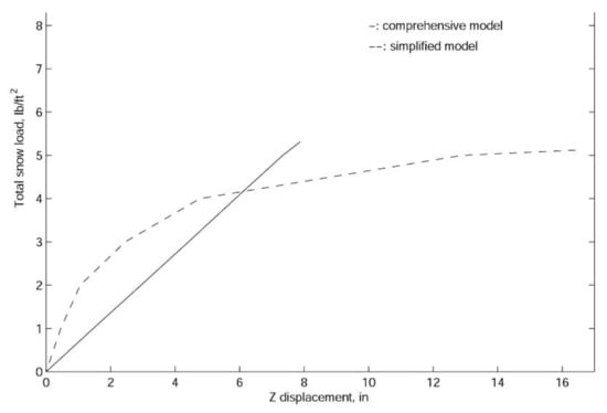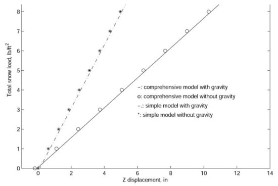 According to Figure 7, the linear responses of the two sets of models are very different. However, in both models, gravitational load (shelter self-weight) can be ignored. It is interesting to note that for the comprehensive model, due to the assemblage stress, the initial shelter displacement is in the opposite direction of the gravitational force, and just as for the simplified model, the gravity will slightly increase the downward displacements. It is also shown in Figure 6 that the comprehensive model is much more flexible than the simplified model, which confirms the fact that the simplification of scissor points and hubs will in fact make the model stronger than the actual structure.