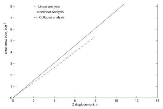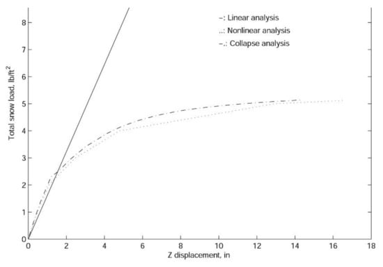 The linear and nonlinear load-displacement curve for the simplified model of the J shelter without end walls.