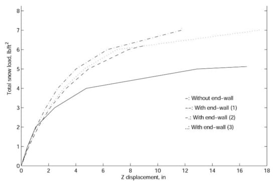 The nonlinear load-displacement curves for the simplified model of the J shelter with three different end wall locations.