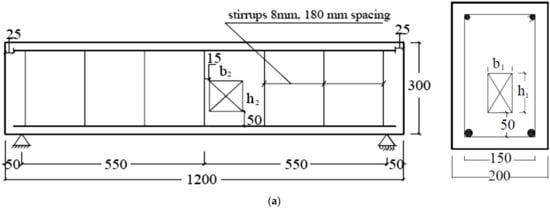 The experimental work was performed by the authors and reported in detail in [13]. This experimental work is summarized herein and used to validate the numerical model that was built to perform an extensive study related to solid and hollow RC beams. According to the data reported in [13], the concrete compressive and tensile strengths (fcu and fct) were 24 MPa and 2.64 MPa (about 11% fcu ), while the concrete modulus of elasticity (Ec) was equal to 22.7 GPa. The properties of the internal steel (diameter = 10 and 12 mm) and stirrups (diameter = 8 mm) are listed in Table 1. All details of specimens’ dimensions, reinforcement, test setup, and instrumentation are illustrated in Figure 1. The length, width, and height of all beams were 1200, 200, and 300 mm, respectively.