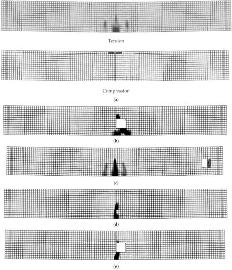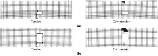 The values of h1, b1, h2, and b2 greatly affected beam stiffness and load capacity as they affected the neutral axis of the beams. In addition, the values of h3 and b3 affected the failure loads and modes as they changed the beam failure from Ys and CC to SH. For simulated beams in groups 2 and 5, as the depth of TNSH was small, its effect on the beam load and deflection was small until maximum load capacity was reached. After the maximum load, the effect of shear on the load and deflection of the beam became obvious as the shear cracking started to deform. As the depth or width of TNSH increased, the shear strength of the beam section decreased, then its effect on increasing the deflection of the beam increased (these results agreed with those reported in [23,24]). As the size of the opening did not affect the shear capacity of the beam, the effect of shear on the total deflection of the beams could be neglected.