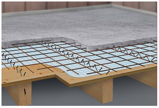 - Woschitz, R.; Deix, K.; Huber, C.; Kampitsch, T. Development of innovative wood-concrete composite slabs in prefabricated construction method. Bautechnik 2021, 98, 12–22. (In German) [Google Scholar] [CrossRef]