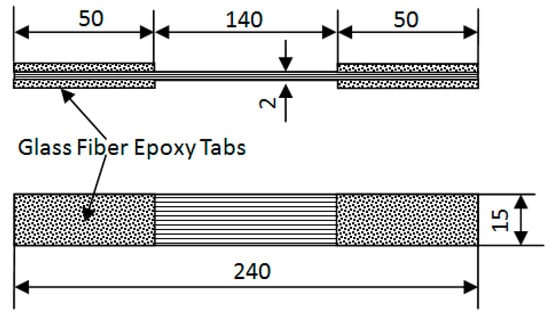 The unidirectional CFRP plate was composed of SYT55S-12K carbon fiber and epoxy resin (Zhongfu Shenying Carbon Fiber Co., Ltd., Lianyungang, China). Rectangular CFRP plates (400 mm × 400 mm × 2 mm) were fabricated using the hot pressing process with 16 plies of unidirectional carbon fiber prepreg material. The curing process was carried out at a constant pressure of 3 MPa and the temperature conditions were a rising temperature to 80 °C for 60 min, then further rising to 165 °C for 90 min, and finally cooling down to room temperature. Material parameters are shown in Table 1. Table 2 shows the details of unidirectional CFRP plate specimens at room temperature. A total of 30 specimens were tested. According to ASTM D 3039/D 3039M-08 [22], the tensile specimens were cut into the standard specimens, as shown in Figure 1, with a width of 15 mm and a length of 240 mm for each specimen. The GFRP sheet with rough surfaces was used as the clamp tabs, which provided high friction and prevented crushing and sliding of the CFRP in the grip area. The micrometer was used to measure the actual cross-section size of the specimen in the center distance area. This size was used to calculate the strength of the CFRP.