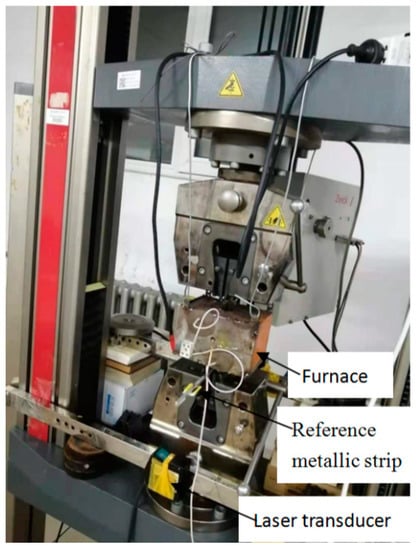 As shown in Figure 3, the axial strain under a high-temperature tensile test should be measured by high-temperature strain foil (FBAB 120-3BB250(2)-x) (ZEMIC, Xian, China) and laser displacement transducer (LK-H155) (KEYENCE (CHINA)CORPORATION, Shanghai, China). The high-temperature strain foils were used to measure the tensile axial strain under 200 °C, which were stuck on the front and back faces of the specimen at the mid of the gauge length; the laser displacement transducers were used to measure the tensile axial strain within the temperature range of 200–600 °C. Two reference metallic strips were fixed at the two ends of the gauge length of the specimen, as shown in Figure 3. Every laser transducer was paired with one reference metallic strip; so, the displacement of reference metallic strip could be tracked by the laser transducer when the specimen was stretched. The specimen’s tensile axial strain was the displacement difference measured by the two laser transducers.