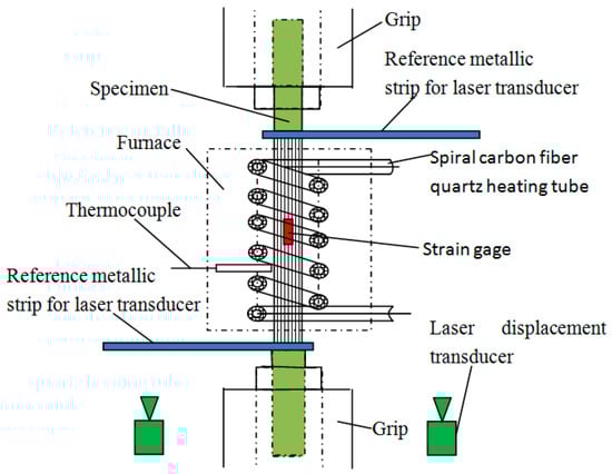 All tests were carried out on ZWICK-100KN testing machine (Zwick/Roell Testing Technology (Shanghai) Co., Ltd., Shanghai, China). The tensile loads and displacements were recorded by the testing machine. Temperature was applied by a high-temperature electric furnace (Self-design) controlled by a temperature controller. Figure 2 shows a high-temperature tensile device set-up, including a universal testing machine fixture, an installed electric furnace, a laser displacement sensor (KEYENCE (CHINA) CORPORATION, Shanghai, China), a reference metal strip, and a CFRP specimen. A simplified schematic of the high-temperature electric furnace and specimen deformation measurement method details are shown in Figure 3. The electric furnace, with a maximum temperature of 1500 °C and obtained heat from one far-infrared spiral carbon fiber quartz heating tube with a diameter of 70 mm, length of 90 mm, and 1000 W, controlled its heat efficiency by tuning the applied voltage to extend the used life of the heating tube of the electric furnace, realizing uniform heating and temperature control. A thermocouple was used to measure the electric furnace’s chamber temperature. The temperature was the real-time temperature of the specimen. The furnace was not sealed, and the bottom and top were open for oxygen circulation. In order to model the real firing resistance environment, the mechanical behaviors of specimens at 22 °C, 200 °C, 300 °C, 400 °C, 500 °C, and 600 °C were adopted. Before the tensile test, the specimen was heated to the specified temperature and held at that temperature for 20 min to keep the plate section at a constant temperature, thus causing physical and chemical changes in the epoxy resin. Then, a tensile load was applied to the specimen until the specimen failed. During the heating and holding phases, the specimen was clamped at one end. The original unclamped end of the specimen was closed before loading. Then, the specimen was loaded (while still subject to temperature) to failure at 0.75 mm/min in beam displacement control mode.