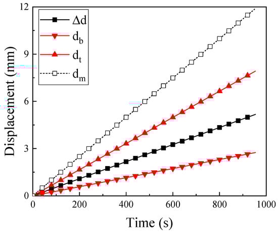 Figure 4 shows the typical displacement-time curves captured by the testing machine and laser transducers as the CFRP laminate exposure at 200 °C. In the figure, db and dt represent the displacement of the bottom and the top laser transducers, respectively. The Δd is the difference between the db and dt, which indicates the in situ displacement of the specimen. The dm is the result recorded by the testing machine. It is clear that the error between the two measurements increased with the testing time, with the maximum error exceeding 100%. The result demonstrated that the load cells in the machine can be influenced significantly during the test process, and the laser transducer measurement technology is an ideal measurement method for a CFRP high-temperature test.