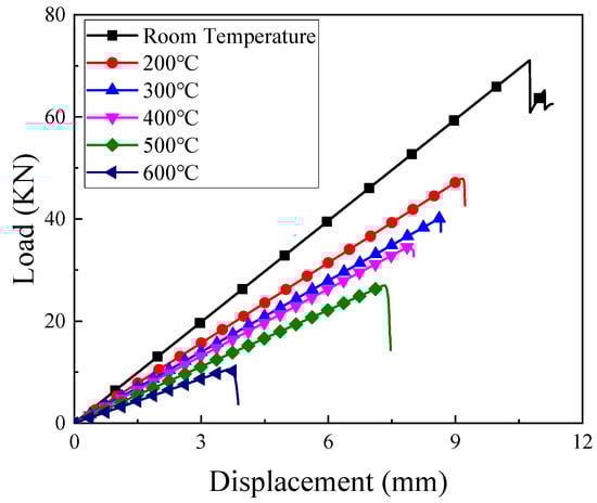 The typical tension-displacement curves of the testing machine at different temperatures are shown in Figure 5. The maximum tensile displacement decreased with the increase of temperature: 10.75 mm, 9.15 mm, 8.65 mm, 7.90 mm, 7.30 mm, and 3.65 mm for the temperature of 22 °C, 200 °C, 300 °C, 400 °C, 500 °C, and 600 °C, respectively. Compared with the fracture strain at room temperature, the fracture strains at 200 °C, 300 °C, 400 °C, 500 °C, and 600 °C dropped 14.8%, 19.5%, 26.5%, 32.1%, and 66.0%. The sharp decrease of the fracture strain, especially at 600 °C, was the dominant factor for the different failure modes.