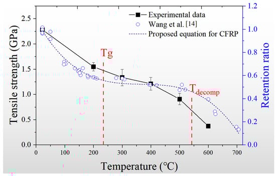 Figure 6 shows the tensile strength and the associated strength retention ratio of the CFRP laminates under the different temperatures. The experimental result conducted by Wang et al. [14] is plotted in the figure to make a comparison with the data captured by the laser transducer system. Due to the different manufacturing procedures and component parameters, the strength retention ratio was used to replace the strength obtained by Wang et al. [14]. The ultimate tensile strength of the CFRP plate exposure to high temperature was focused by the researchers for decades, resulting in several models to predict the tendency. Therefore, the sigmoid function proposed by Bisby [13] was adopted to fit the ultimate strength in Wang et al. [14]. The results showed the CFRP laminate tested in the current paper had a similar tendency with the references. According to the glass transition temperature (Tg) and evaporation of the resin (Tdecomp), the data captured by the laser transducers exhibited more intensive changes between the Tg and Tdecomp, in which the tensile strength measured by previous studies was supposed to be a plateau. The real tensile strength of the CFRP laminate experienced rapid degradation as the temperature exceeded 400 °C.