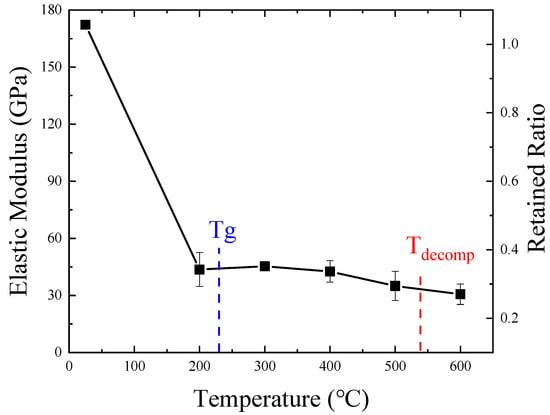 Figure 7 shows the variety curve of specimen elastic modulus with temperature. The ratio of elastic modulus at various temperatures to elastic modulus at room temperature is also shown in this figure. During the test, it was found that the furnace emitted white smoke when the temperature was greater than 230 °C, indicating that the resin had decomposed and volatilized. As can be seen from Figure 7, when the temperature exceeded 22 °C, the elastic modulus decreased rapidly. The elastic modulus remained at 29% at 200 °C. This was inconsistent with the results of previous studies [13]. The reason for this result is that the tensile properties of the fiber composites were controlled by the fiber; the fiber oxidation and resin softening had significant effect on the elastic modulus.