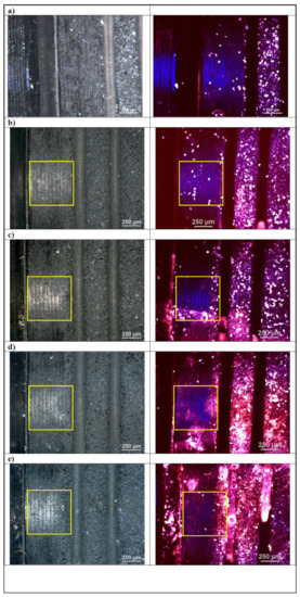 In order to assess the surface of the tested material before and after the laser irradiation process, microscopic examinations were performed using confocal microscopy. The photo shows microscopic photos taken in reflected polarized light (left column) and with the use of a laser with a wavelength of λ = 405 nm (right column). The test results are shown in
