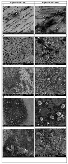In order to evaluate changes in surface morphology, SEM analysis was performed. A set of SEM images showing the topography and morphology is presented in