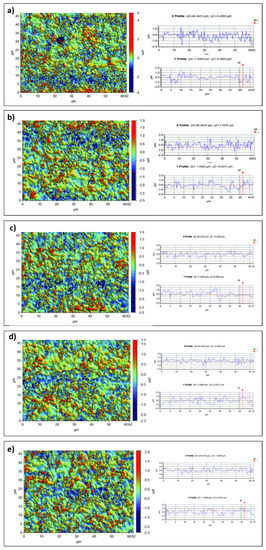 Linear profiles in the X axis and the Y axis were also made and the following roughness parameters were determined: the arithmetic mean of the elevation profile Ra and the mean square elevation profile Rq and the maximum height of the profile Rt. The roughness parameters were determined for three areas of the test samples for the following scan sizes: 117.2 µm × 156.3 µm and 45 µm × 62 µm. This paper presents the results of the research performed for a larger scan area: 117.2 µm × 156.3 µm. In order to determine the roughness parameters correctly, the sample inclination was corrected, and the waviness of the surface was taken into account.
