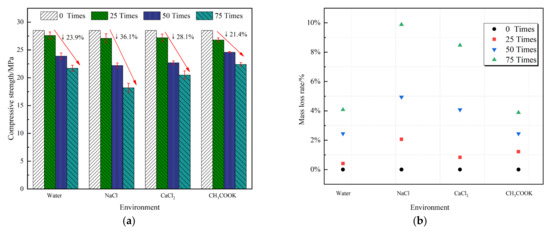 Figure 3a shows that the compressive strength of the specimen in NaCl solution decreases the most after 75 freeze-thaw cycles, which was 36.1% lower than that before freezing and thawing. The compressive strength of concrete in the CaCl2 solution was reduced by 28.1%. The value was 23.9% in a clear water environment. The CH3COOK solution environment has little effect on the compressive strength of concrete, and the compressive strength decreases by 21.4% after 75 freeze-thaw cycles.