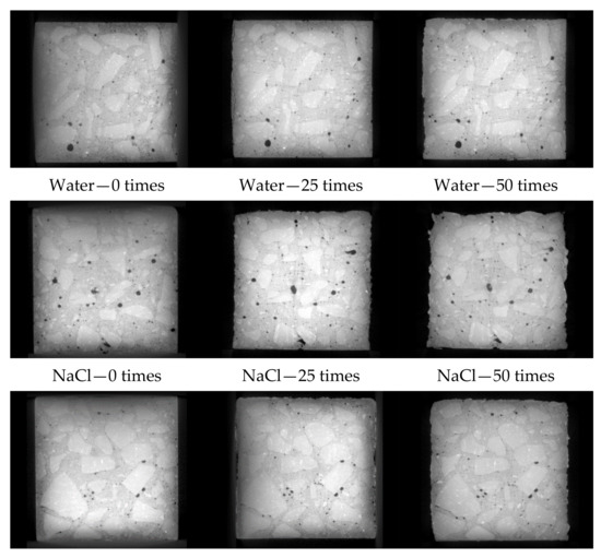 Considering the 500th slice of the intermediate layer as an example (Figure 4), the concrete surface is flat and regular before freezing and thawing. After 25 freezing and thawing cycles, the surface is serrated, a few cracks appear at the edge, mortar peeling appears on some surfaces, and small holes appear in the concrete. After 50 freeze-thaw cycles, the number of spalling increases, the spalling phenomenon is more obvious, and the internal pores increase. Some small- and medium-sized pores gradually evolve into macropores during the freeze-thaw cycle. In the clean water and CH3COOK solution environments, the surface of the test piece is still relatively complete after 50 freeze-thaw cycles; only part of the mortar is peeled off, in a dispersed state, and the aggregate is slightly exposed. After 50 freeze-thaw cycles in the CaCl2 solution, although passivation occurs at the edges and corners, its shape is relatively regular. A small amount of aggregate is exposed, and the mortar peeling phenomenon is severe. In the NaCl solution environment, the surface mortar peeling and roughness of the test piece occurred after 25 freeze–thaw cycles. The closed hole in the lower surface of the test piece forms an opening due to mortar peeling. After 50 freeze-thaw cycles, the surface has severe mortar peeling; many aggregates are exposed and severely deteriorate.