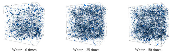 Avizo software is used for threshold segmentation of 2D section data. The pores of each layer of the concrete slice are extracted using different gray levels for 3D reconstruction to obtain the 3D model of internal pores and analyze the influence characteristics of the freeze–thaw environment on concrete pores from the 3D pore distribution. Different pores are classified into large, medium, and small according to the pore volume. Among them, pores with volume V less than 0.1 mm3 are small pores, 0.1 mm3 ≤ V ≤ 1 mm3 are medium pores, and V greater than 1.0 mm3 are large pores.