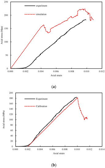 The simulated results of the uniaxial test in UDEC before and after calibration are shown in Figure 3, and the parameters before and after calibration are shown in Table 1 and Table 2. The data of experiment curves and the experimental test method were obtained from Chen et al. (2017) [4]. Several phenomena are illustrated in the Figures: (1) The simulated curves have no compaction stage and started from the elastic stage. Therefore, the simulated curves are translated to the endpoint of the elastic stage of experimental curves for calibrating the parameters; (2) the simulated curves have obvious stable crack developing stage and unstable crack developing stage; (3) the elastic modulus before calibration is higher than that after calibration. However, due to the calculation of the crack developing stage, the results before and after calibration are similar. If the strain is recorded from 0 after calibration, the peak strain will be the result of a lack of the compaction stage strain; and (4) when the experimental Young′s modulus is selected to calculate the joint parameters, the simulated peak stress is larger than the experimental result. When the experimental elastic modulus is selected to calculate the joint parameters, the simulated peak strain is smaller than the experimental result.